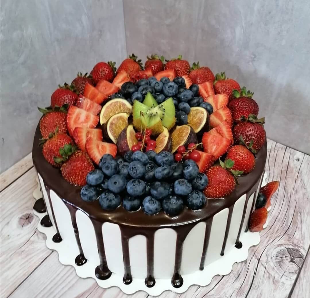 Обилие свежих фруктов и ягод в тортике повышает успех праздничного вечера!